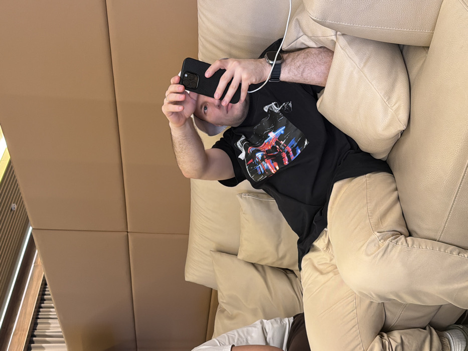 An indoor scene in the city of Sukhaya, Russia, depicts two individuals seated on a light beige, possibly leather, sectional sofa. The prominent subject, a male, is positioned centrally, wearing a white bucket hat, a black short-sleeved t-shirt with a multi-colored graphic print, and light beige pants. He is holding a dark-colored smartphone with a black textured case in his right hand, oriented towards its screen, while his left hand is raised towards his head, possibly adjusting his hat or shielding his eyes. A charging cable extends from the smartphone. A silver Apple Watch Ultra with a light-colored band is visible on his left wrist. To his left, a second individual is partially visible, wearing a white t-shirt and brown pants, seated on the same sofa. The background consists of large, padded, light brown wall panels. The upper ceiling area shows wooden slats and linear lighting elements. Several matching light beige throw pillows are arranged on the sofa.