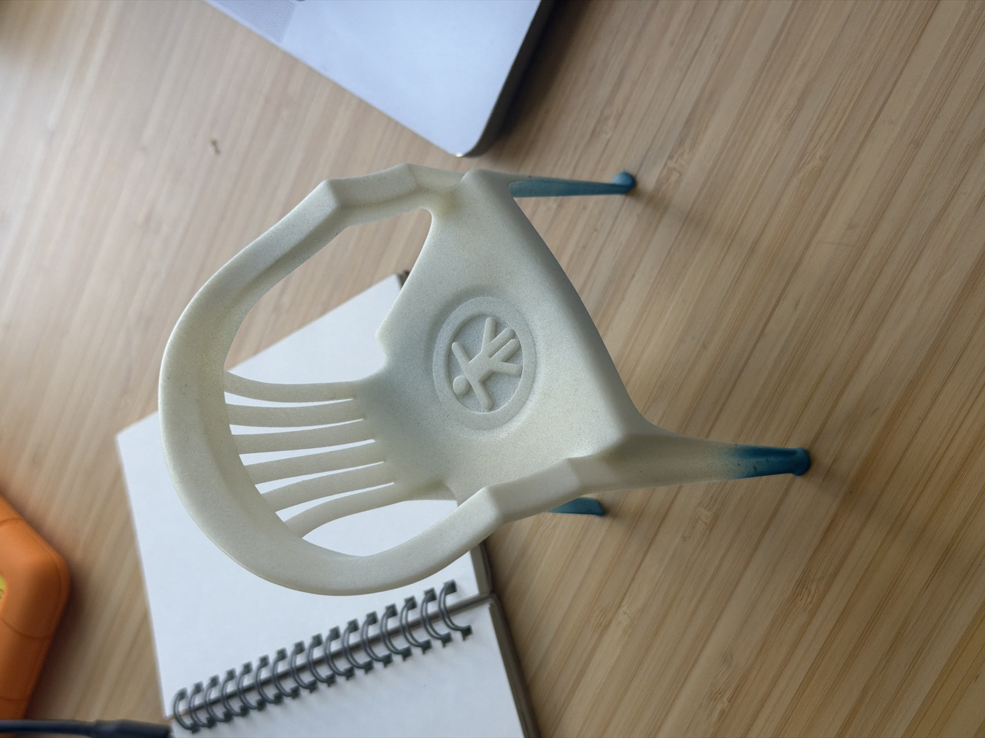A high-angle, close-up shot depicts a light-colored, miniature plastic chair with a distinctive logo on its back, situated on a desk alongside other common objects. The chair has a rounded backrest with horizontal slots and rests on blue-tipped legs. A spiral-bound notebook with white pages is positioned beneath the chair. Parts of a laptop and an orange object, possibly a container, are visible in the background, with a pen lying nearby. The surface of the desk is made of light-colored wood. The location and people are not discernible from the image.