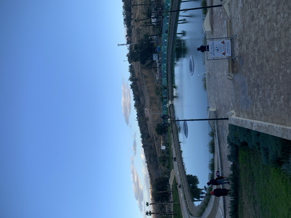 A sideways view captures a park scene with a long body of water reflecting the blue sky