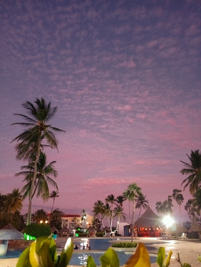 This image captures a resort scene at dusk in Playa El Agua, Venezuela