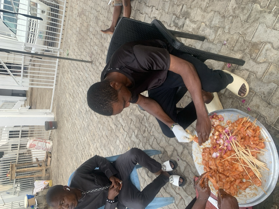 Two men sit on chairs outside around a large round tray of raw, marinated chicken and onions on skewers. One man wears a black shirt and white gloves, skewering the chicken. The other wears a black outfit with white slides. They are on a patio of gray brick. A building, white truck, and white fence are visible in the background.