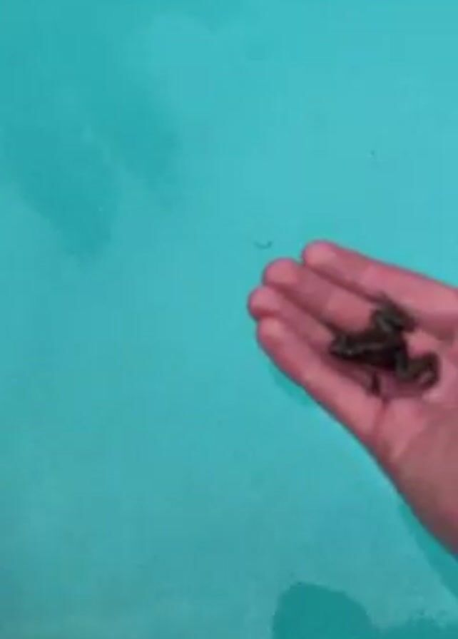 hand holding a small, dark-colored frog over a light blue, possibly tiled surface that could be the bottom of a pool