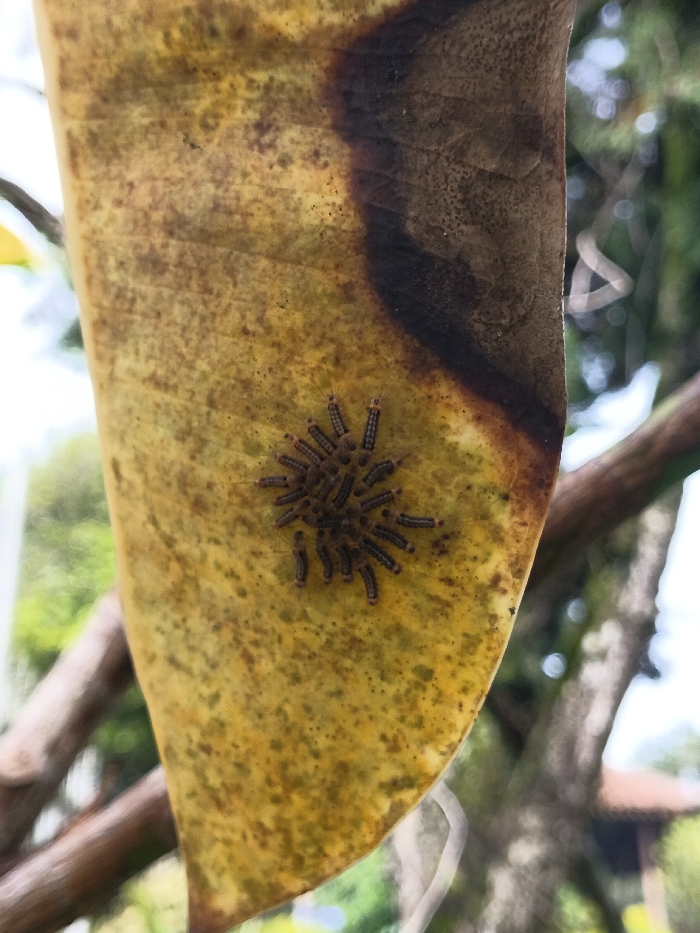 A close-up shot reveals a cluster of small, dark caterpillars huddled together on a large, decaying leaf