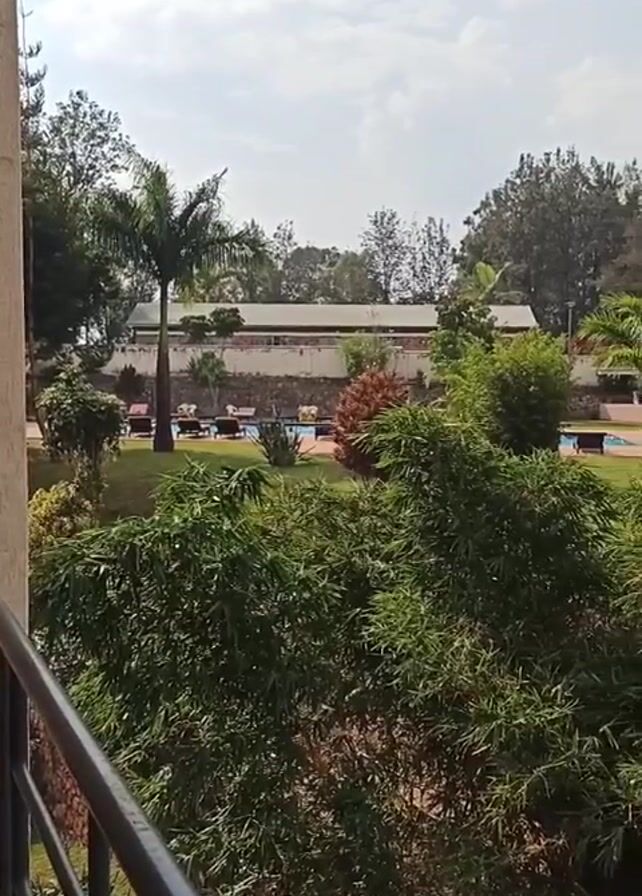 The camera pans right across a verdant outdoor scene from an elevated position, likely a balcony. In the foreground, the gray balcony railing is visible with dense green bushes and trees filling the lower part of the frame. Beyond the foliage lies a well-manicured lawn. A swimming pool with lounge chairs around it is partially visible in the center. Further back, a building with a light-colored facade and brown accents sits in the distance. To the right, a gazebo-like structure with a blue roof is prominent, connected to another blue-roofed walkway. Various trees and plants are scattered throughout the area. The sky is a light blue with some white clouds. Sounds of music can be heard in the background.