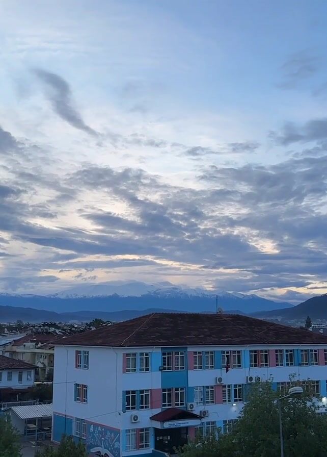 cityscape with a school building in the foreground, set against a backdrop of mountains and a cloudy sky. The school is painted white with pink and blue window frames and a brown roof. Residential buildings with red tile roofs surround the school. In the distance, mountains are visible, some with snow-capped peaks. The sky is filled with a mix of blue and gray clouds, with streaks of light breaking through. The overall scene appears peaceful and serene, likely captured during the early morning or late evening due to the soft lighting.