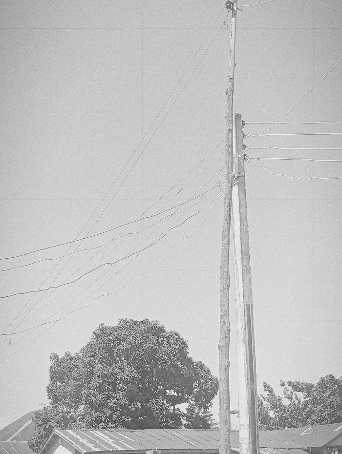 The image is a grayscale photograph depicting an outdoor scene in Zawan, Nigeria, under a clear sky. On the right side, two utility poles are visible: a lighter concrete pole on the far right and an adjacent, darker pole of organic or heavily weathered material. Multiple overhead wires, some showing slack, extend horizontally and diagonally across the upper and middle sections of the frame, connected to these poles. In the mid-left, a large tree with a dense canopy is prominent, positioned above the corrugated metal roofs of structures partially visible in the lower foreground. No individuals, specific actions, or interactions are discernible.