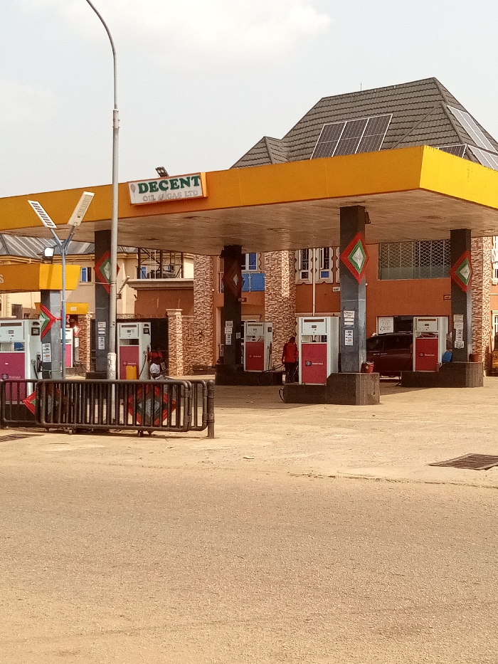 This image depicts the forecourt of "DECENT OIL & GAS LTD," a gas station situated in Nsugbe, Nigeria