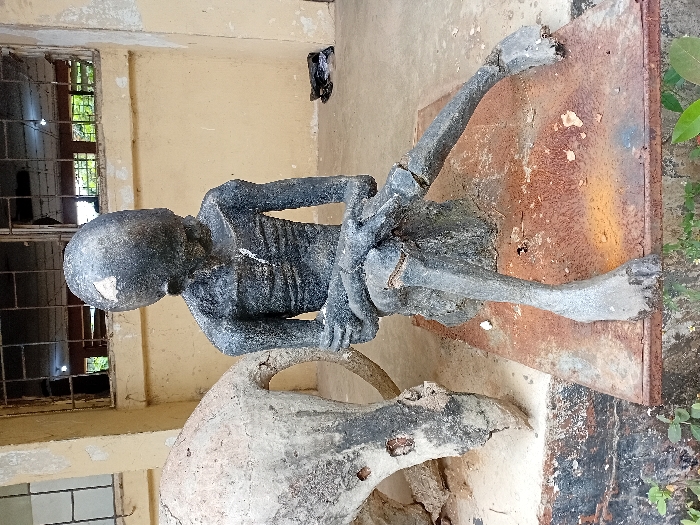 The image displays two weathered sculptures positioned outdoors in Lokoja, Nigeria. The prominent sculpture, centrally located, depicts a dark, emaciated, human-like figure seated on a rusted, rectangular metal base. This figure, likely composed of concrete or a similar material, exhibits pronounced ribs, crossed arms, and extended legs, with visible material loss and chipping on its surface, notably on the head and legs. Its head is smooth and lacks discernible facial features. To the left of this figure, partially visible, is a lighter-colored concrete sculpture resembling the rear section of an animal, possibly a cow or horse, also showing signs of deterioration. In the background, a light-colored, possibly cream-colored, building wall is present, featuring two windows fitted with dark metal grates; the windowpanes appear damaged. A black plastic bag or bundle rests against the building wall to the right. The sculptures are situated on a light-gray concrete ground surface, with green foliage visible in the foreground at the bottom of the frame.