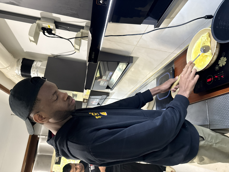 A man in a black hoodie and baseball cap stands at a kitchen counter, cooking. He stirs scrambled eggs in a pan on an electric stove. A metal spatula rests in the pan. A kitchen fan hangs overhead, and another person partially visible in the bottom center. The kitchen has white walls and tiled flooring.
