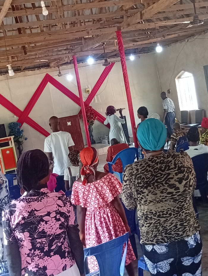 The image displays an indoor communal gathering in Isinyi-Nando, Nigeria