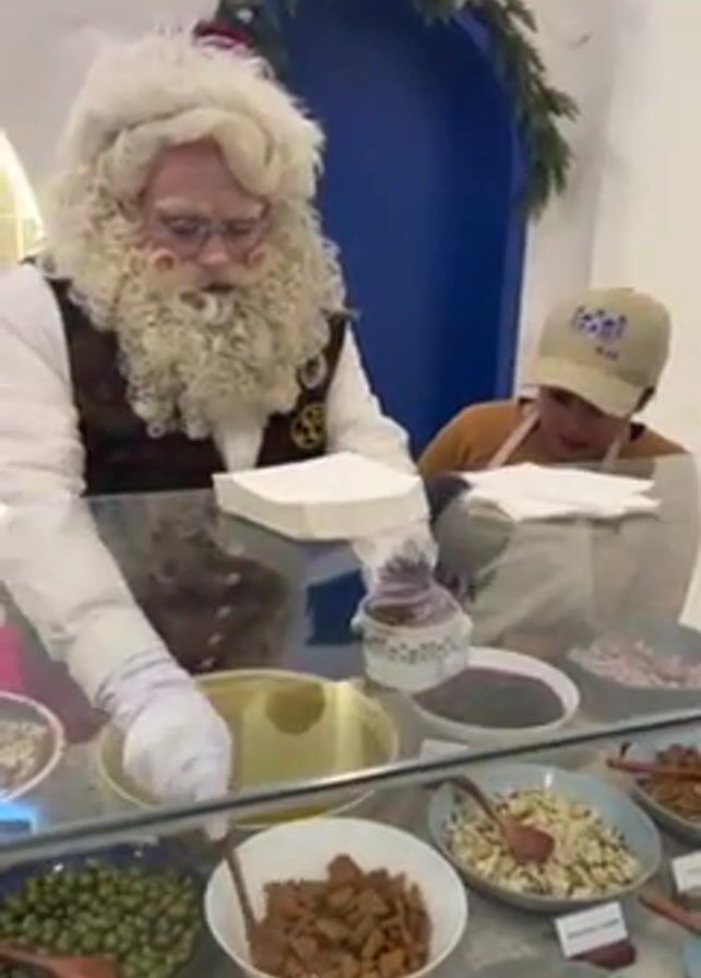 In a brightly lit interior decorated for Christmas, a person dressed as Santa Claus stands behind a glass counter full of bowls containing various toppings