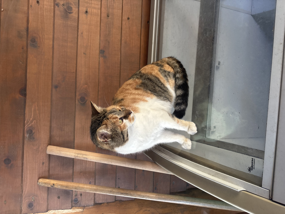 - "The image captures a single calico cat sitting on the glass top of a commercial display unit in Donji Štoj, Montenegro" by FM-CAOHw1, licensed under CC BY 4.0