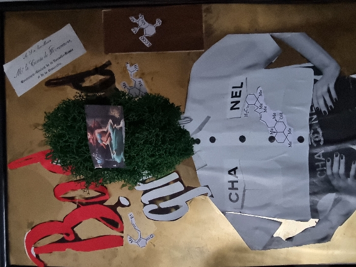 The image displays a framed, mixed-media collage artwork. The central element is a stylized, headless figure. The head is replaced by a dense, dark green, moss-like mass. Affixed to this mass is a small rectangular print depicting a partially nude figure, possibly a mermaid, in a blue-green watery setting. The figure's torso is a white paper cut-out of a short-sleeved, collared shirt with five black buttons, featuring "CHA" on the left chest pocket and "NEL" on the right. Below the shirt, a black and white image shows a person's midsection with hands on hips, wearing a top labeled "CHANEL" with the interlocking C's logo. The background of the collage is a gold-colored sheet. Scattered across this background are various paper cut-outs: large red script letters, likely forming part of "Bold" or "Bond," and partially visible white letters forming "girl" beneath. Multiple white paper cut-outs of organic chemical structures are also present. In the upper right quadrant, a small white rectangular paper with French text, beginning "A Ma soeur," is visible. The entire artwork is enclosed within a simple black frame. The image provides no discernable information regarding its specific location within Moscow, Russia.