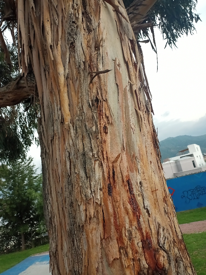 A close-up view showcases the textured bark of a eucalyptus tree. The bark is light tan to brown, peeling in strips. A small, broken branch protrudes from the trunk. In the blurred background, greenery suggests a park or natural setting. A blue wall with graffiti and white buildings are visible in the distance, indicating an urban environment nearby. The scene is captured in daylight under a slightly overcast sky.