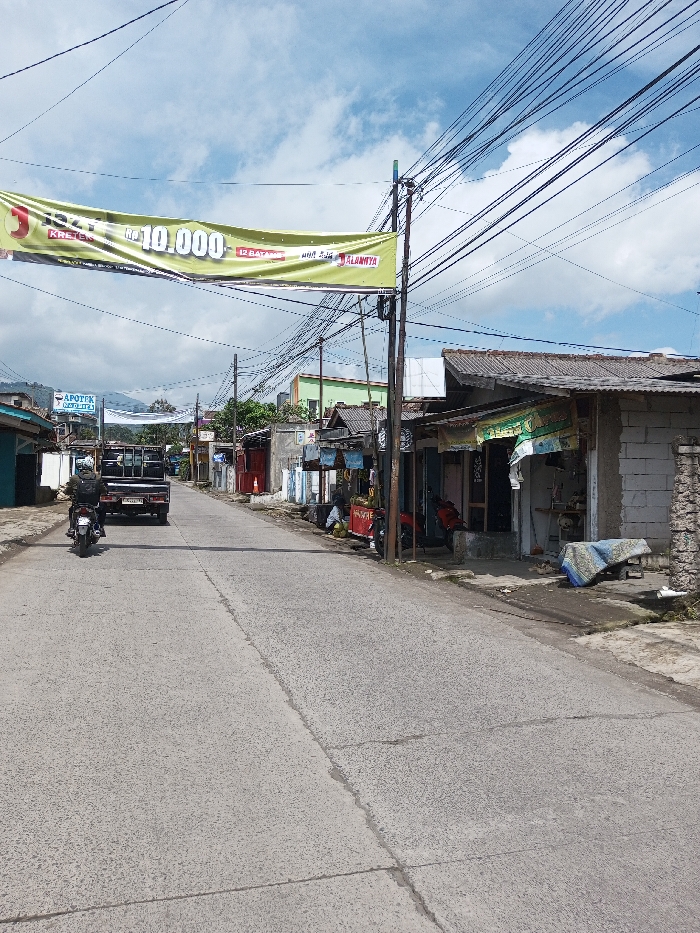 The image displays a daytime street scene in Ariyalai, Sri Lanka, under a blue sky with scattered white cumulus clouds. A two-lane paved road, exhibiting cracks and expansion joints, extends into the distance. In the left lane, a person wearing a dark jacket and helmet operates a dark motorcycle, following a dark, open-bed pickup truck whose license plate is partially visible. Further along the left side of the street, a blue and white sign for "APOTEK NADIESTA" is mounted. On the right side of the road, a utility pole is prominent, supporting a dense array of black electrical and communication wires spanning above the street. Suspended horizontally across the street is a large, yellow-green banner featuring text such as "Rp 10.000," "KRETEK," "12 BATANG," and "ALAMNYA." Below the banner, a series of structures line the street, appearing to be a mix of informal shops and residences with corrugated metal or tiled roofs. A red scooter is parked in front of one such establishment. Further down, a red stall displays produce, likely bananas, with a partially visible individual seated nearby. An adjacent building features exposed concrete block walls, with a blue tarp or fabric draped in front of it. Laundry is seen hanging outside some of the structures. In the background, distant hills or mountains are visible.