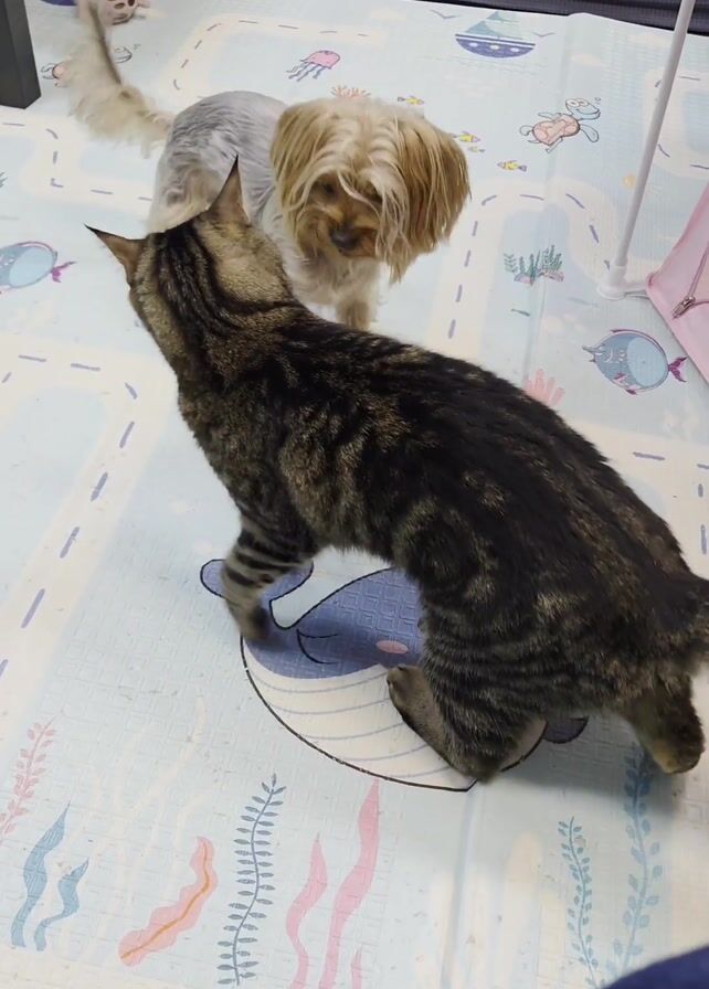- "tabby cat sitting and a small, light brown and grey dog standing on a colorful play mat" by FM-5o4p43, licensed under CC BY 4.0