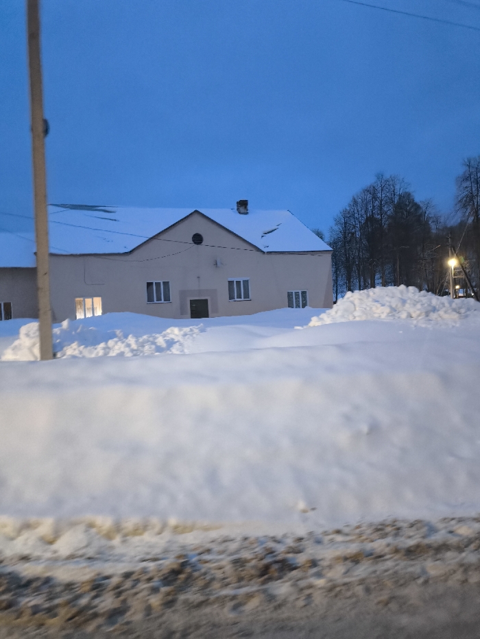 This image depicts a winter scene in Красный Маяк, Russia, under a dark blue twilight sky. The central subject is a two-story, light-colored building with a dark pitched roof, heavily covered in snow. The building features multiple rectangular windows with white frames, a central recessed entrance with a dark door, and a circular window in the central gable. Interior light is visible through a window on the building's left side. A light-colored utility pole stands in the left foreground. The ground is largely obscured by substantial, uneven snowdrifts, which partially cover the lower portion of the building. To the right, bare trees are silhouetted against the sky, with a brightly illuminated streetlamp visible near the treeline. The immediate foreground reveals a darker, possibly soiled, layer of ground or snow. No individuals are present.