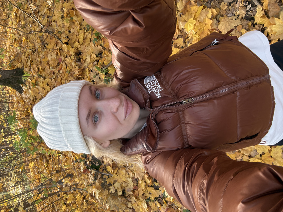 A blonde-haired, blue-eyed female subject is captured in a close-up, selfie-style photograph taken outdoors. She wears a white ribbed knit beanie and a glossy brown puffer jacket featuring "THE NORTH FACE" logo in white on the left chest. A white t-shirt is visible beneath the jacket. The subject's right arm is extended, indicating she is holding the camera, and she faces the lens with a neutral to slight smile. The background is an autumnal, wooded environment characterized by a dense ground cover of vibrant yellow fallen deciduous leaves. Tree trunks and bare branches, with some sparse green foliage, are visible behind the subject. The scene is illuminated by natural daylight. The setting is a natural, wooded area or park within the city of Voronezh, Russia.