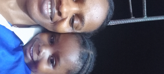 A woman and a young girl smile at the camera in a close-up shot. The woman is at the top, with the girl below her. Both have dark hair and skin. The girl is wearing a blue shirt. The background is dark, with a metal structure visible in the top right corner. They appear to be posing for a selfie.