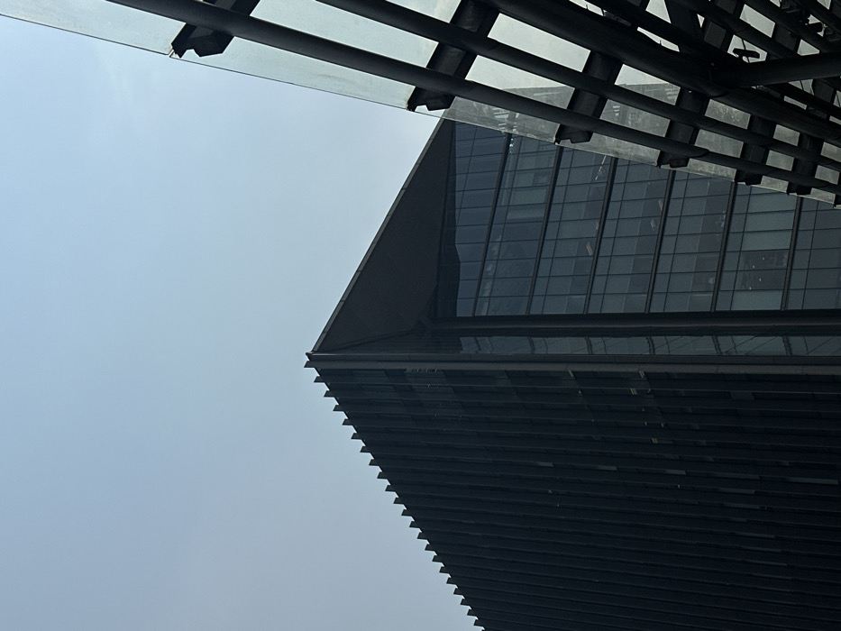 A low-angle shot captures an architectural scene with sharp lines and contrasts. A dark, angular building occupies the right side, its facade featuring repeating horizontal elements. The upper part of the building has windows. An overhead structure of intersecting glass and metal beams appears above, creating a geometric frame. The sky, a pale blue, fills the negative space on the left, contrasting with the dark building.