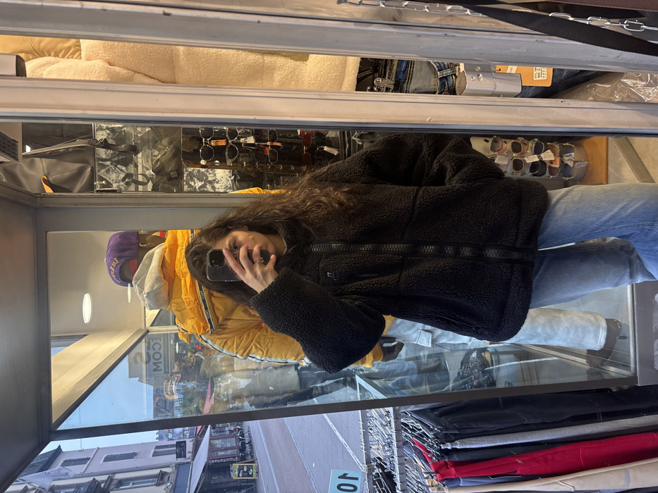 A young adult female is captured in an indoor retail setting, taking a mirror selfie with a dark-colored smartphone held in her left hand, which partially obscures her face. She possesses long, wavy dark brown hair and has a light yellow mark visible on her right cheek. Her attire consists of a black, zippered, high-collared sherpa fleece jacket and light blue denim jeans. The immediate indoor environment is a clothing store. To her left, a metal rack displays various garments on hangers in colors such as red, black, grey, and cream. Directly behind her, a mannequin, visible from the torso down, wears a bright yellow puffer jacket over a grey hooded sweatshirt, light-colored cargo pants, and a purple baseball cap. To her right, a multi-tiered display stand holds numerous pairs of sunglasses, and additional clothing items, including a cream-colored sherpa jacket, are visible. The interior is brightly illuminated by overhead lighting. Reflected in the mirror is the store's large glass front window, which displays an outdoor street scene in Strasbourg, France. The reflection shows traditional multi-story European buildings with warm-toned facades lining a street or pedestrian area. A sidewalk with a few indistinct individuals walking is discernible. The sky appears overcast. Partially visible reversed text, including "COM" and "200," is present in the reflection, likely from a sign or storefront across the street.
