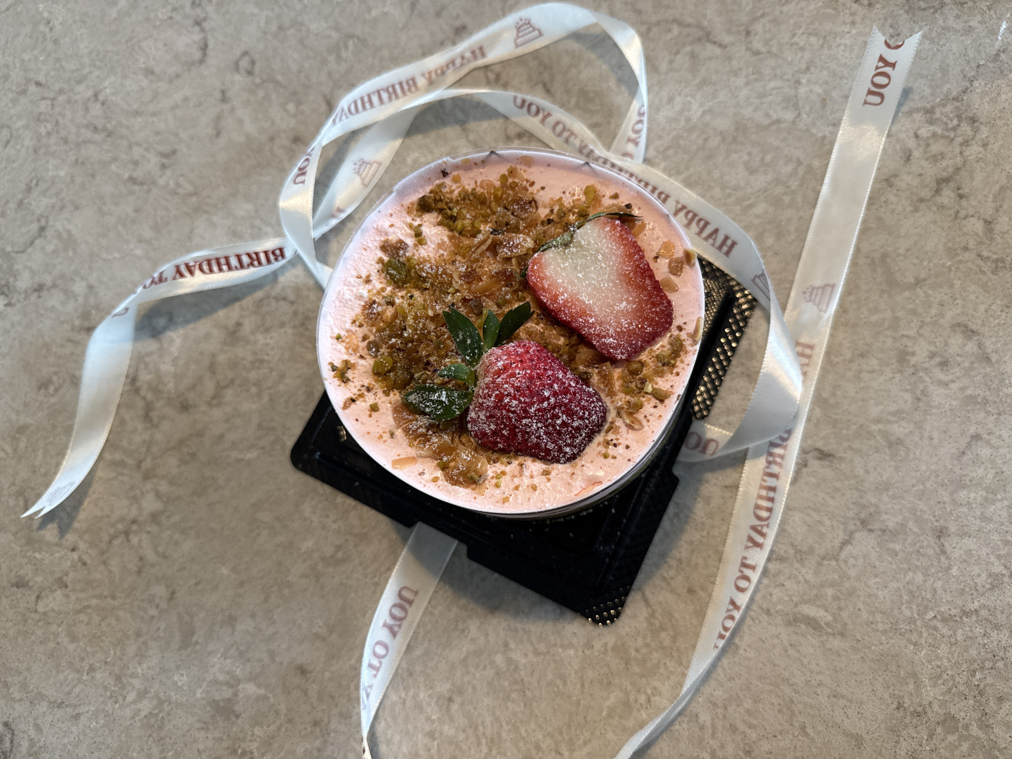 Here is a concise description of the image: The image shows a single-serving dessert presented on a black, square base. The dessert appears to be a pink mousse-like creation, topped with two strawberry slices, pistachio pieces, and a small mint sprig. A white ribbon with the text "BIRTHDAY TO YOU" printed in red surrounds the dessert. The background is a gray, textured surface. There is no information in the image to suggest it is in Orlando, United States.