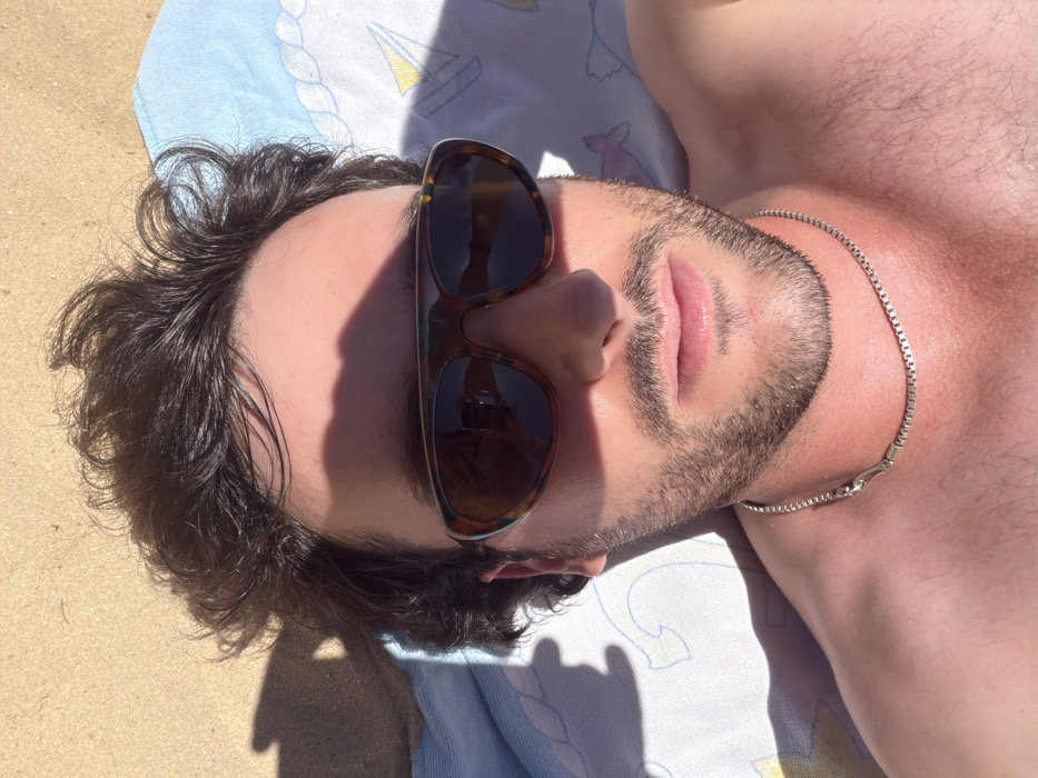 A man wearing sunglasses lies on his back. Part of his face is obscured by shadows and the sunglasses, which are reflected in the lenses. He has dark, wavy hair and a neatly trimmed beard. A silver chain adorns his neck. He is lying on a light blue towel with yellow and white sailboat patterns. The background appears to be sandy. The man's skin is tanned and there is visible body hair on his chest.