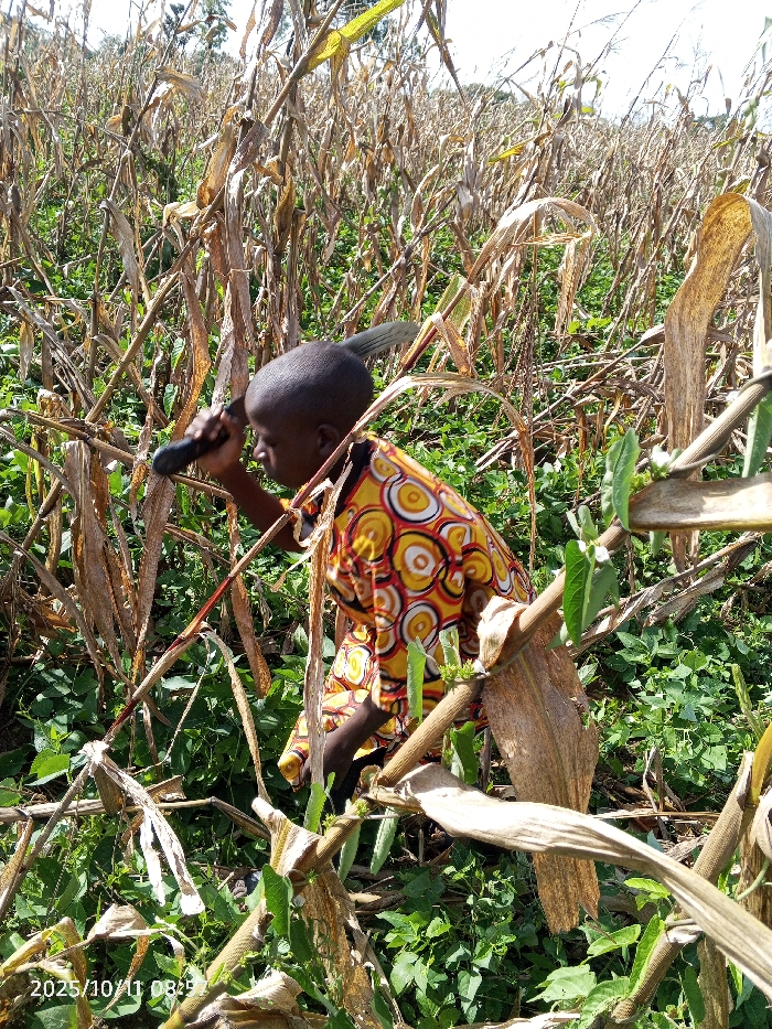 An individual is depicted in a field located in Kamantan, Nigeria, on October 11, 2025, at 08:25. The person, with dark skin and a closely cropped head, wears a short-sleeved shirt patterned with yellow, orange, red, and white concentric circles. They are positioned within a dense environment of dried, light brown corn stalks and a thick undergrowth of vibrant green leafy plants. The individual holds a dark-colored tool, resembling a small hoe or a short-handled machete, in their right hand, directed towards the vegetation. The background features a continuation of the dried cornfield under a bright, hazy sky.