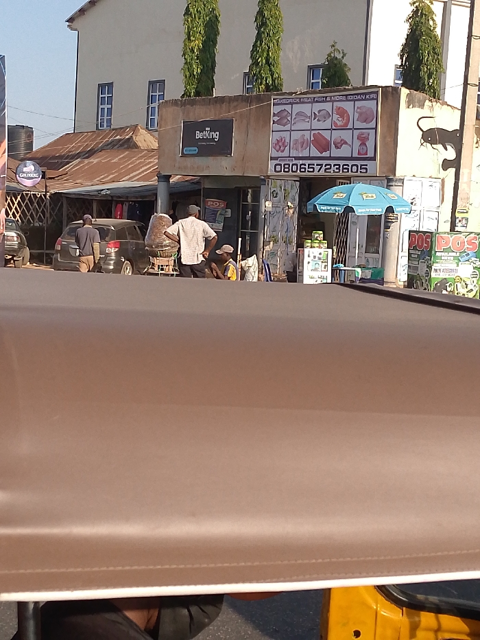 The image depicts a street scene in Bar Jirgi Summa, Nigeria, observed from inside a vehicle with a brown canopy dominating the lower portion of the frame. The scene features a two-story building with a light-colored facade and multiple windows on the upper floor, partially obscured by two tall, slender trees. Below this, a single-story commercial structure features a corrugated metal roof and various storefront signs. On the front of the commercial structure, a black "BetKing" sign is visible on the left, and a larger sign titled "MAKDEDRICK MEAT, FISH & MORE (IDAN KIRI)" displays images of various seafood and meat products, along with the phone number "08065723605". To the right of this sign, a black silhouette of a catfish is painted on the building. On the roadside, four individuals are present. A man in a light-colored plaid shirt and dark trousers stands with his hands on his hips, facing left. Near him, a person in a yellow shirt and dark cap is seated on the ground. To the left, a man in a blue shirt and dark trousers is bending or squatting next to a parked black SUV. A small cart with a large woven basket containing goods is positioned behind the standing man, adjacent to the SUV. Further right, a small stall is set up under a light-blue umbrella. Several "POS" (Point of Sale) signs are visible, including one beneath the blue umbrella and two larger, green "POS" signs further to the right. A round "Goldberg" sign is partially visible on the far left. The bottom right corner of the frame reveals part of a yellow vehicle, consistent with a tricycle. The overall environment appears to be an active commercial area during daylight hours.
