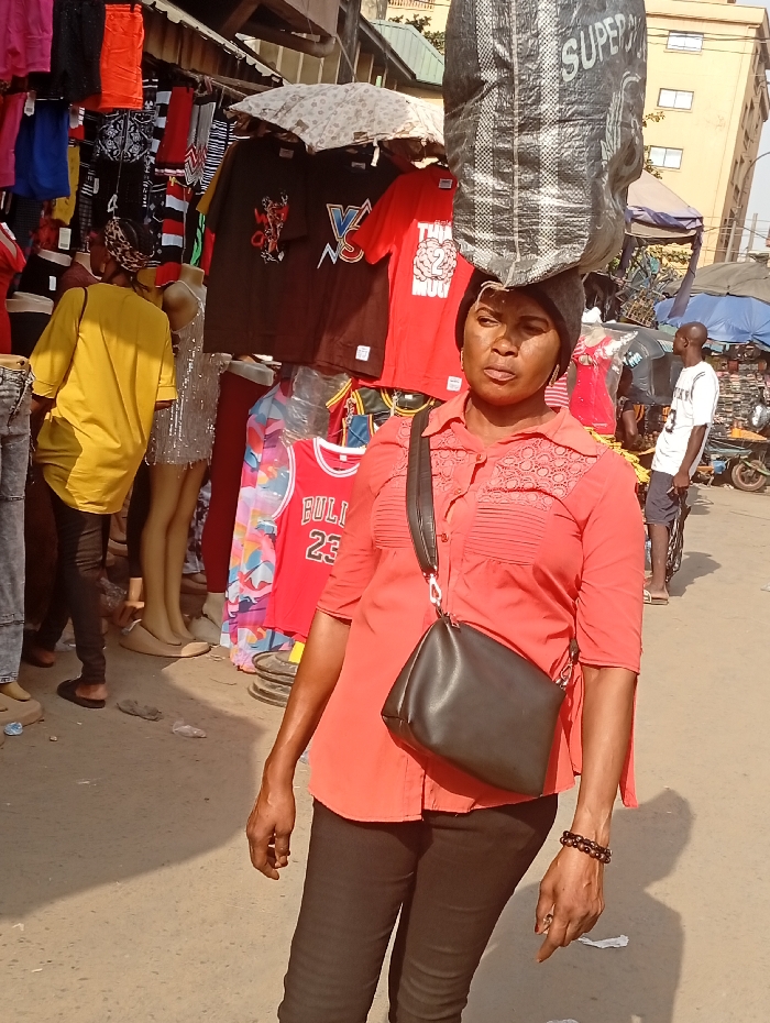 An adult female is centrally positioned, facing forward, carrying a large, dark grey patterned sack labeled "SUPER" on her head, stabilized by a dark beanie. She wears a coral-red short-sleeved collared blouse with lace details and black fitted trousers. A black cross-body bag is slung over her left shoulder, and a dark beaded bracelet is on her right wrist. The scene is an outdoor market in Fegge, Nigeria, characterized by bright daylight. To the left, market stalls display various clothing items, including t-shirts, shorts, and dresses, on racks and mannequins. A person in a yellow long-sleeved top is partially visible behind the mannequins. A white patterned umbrella shades part of a stall. Further back on the right, another male figure in a white t-shirt is visible next to additional stalls and a blue umbrella. The ground is a light-colored, uneven surface with scattered debris. Multi-story buildings are visible in the background under a clear sky.