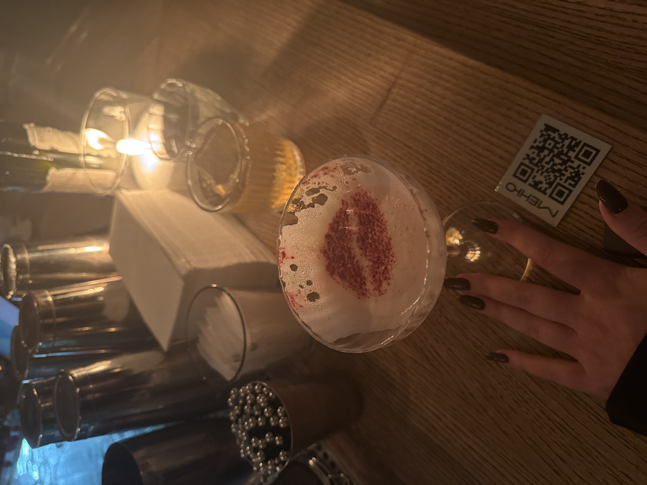 The image depicts a dimly lit bar setting in Dnipro, Ukraine, from an overhead perspective. A central cocktail in a clear coupe glass features a white foam top with a red, lip-shaped design made from granular material. A female hand with long, dark, pointed fingernails rests on a light brown wooden surface, positioned to the lower left of the cocktail glass, with fingers extended towards its base. Adjacent to the hand is a small square sticker displaying a black QR code and the vertical Cyrillic text "МЕНЮ" (MENU) in white. In the background, also on the wooden surface, are multiple objects associated with a bar. These include an array of approximately seven silver-colored metal cocktail shakers or tins, a stack of white folded napkins, and a clear glass filled with numerous white cocktail picks or straws. To the far left, a small copper-toned container holds a collection of small, silver, spherical decorative elements. A lit candle, enclosed in a clear glass votive, provides warm illumination, and a tall, dark green glass bottle is partially visible behind it. Two additional glasses are present to the right of the candle; one contains an amber-colored liquid, and the other is clear. The scene is characterized by soft, warm lighting, indicative of an evening establishment.