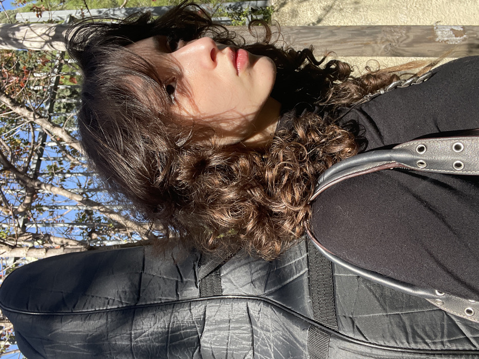 A young individual with dark, voluminous curly hair, appearing in a partial profile facing right, is positioned outdoors in Haifa, Israel. The person wears a black long-sleeved top and a black shoulder bag with metallic eyelets on its strap, slung over the right shoulder. A silver-colored chain is visible on the left side of the neck. To the left and slightly behind the individual, a black, soft-sided guitar case stands upright. The scene is illuminated by strong sunlight, casting distinct highlights on the hair and skin, and shadows across the subjects. The background consists of sparse tree branches against a clear blue sky, with a light-colored wall and a vertical wooden post visible on the right.