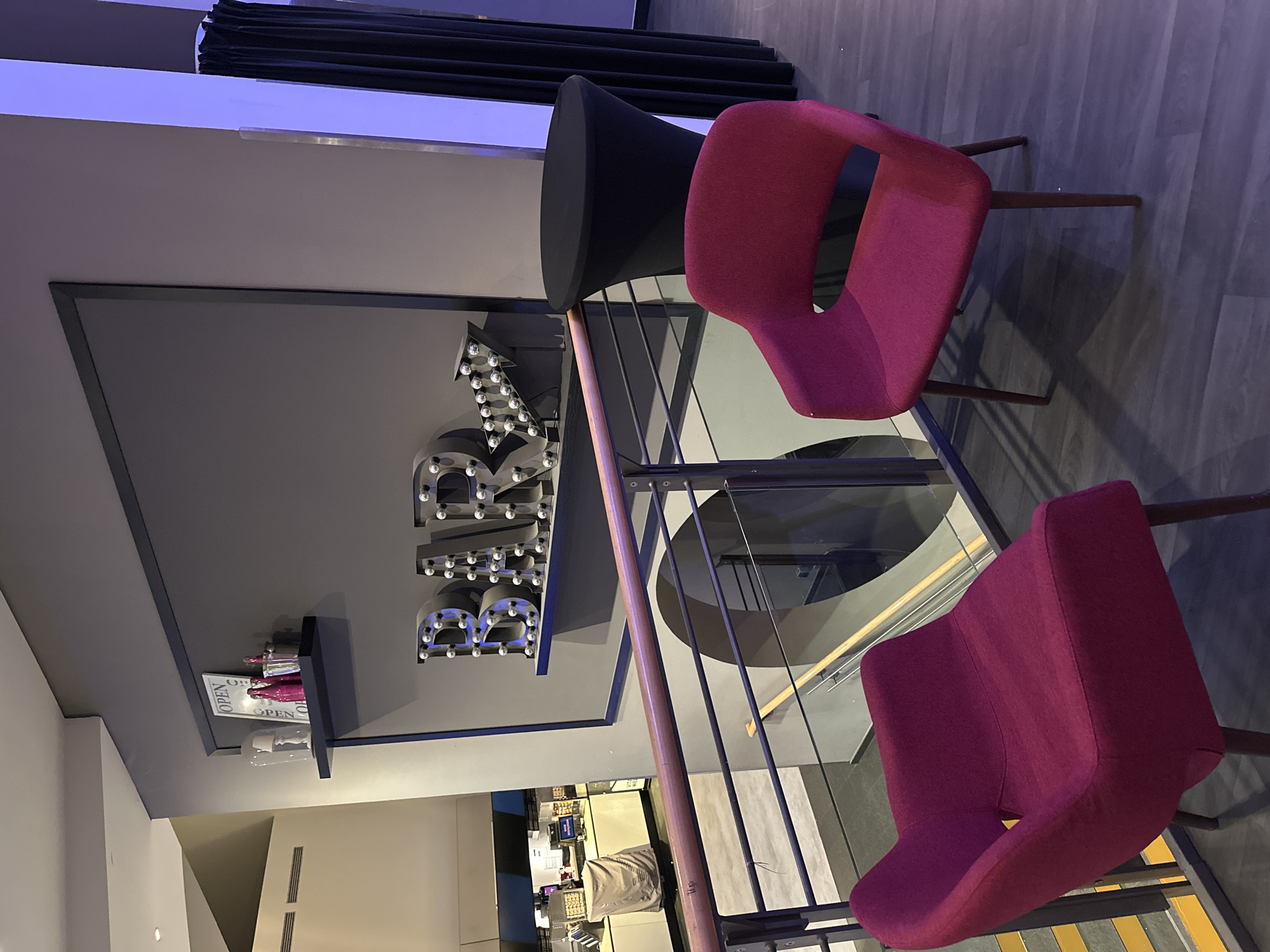 The image depicts an interior view of a multi-level commercial establishment located at Poststraße 5, 20354 Hamburg, Germany. The photograph is taken from an upper-level mezzanine looking down into a retail area and across a lounge space. In the foreground, two identical magenta upholstered armchairs with wooden legs rest on a dark, wood-effect floor. To the right, a black, conical cocktail table covered with dark fabric stands near a vertical blue LED light strip illuminating a wall section adjacent to black pleated curtains. A modern railing with a wooden top rail, metal vertical bars, and glass panels separates the upper level from a curved, descending staircase with light-colored steps. A dark grey accent wall dominates the midground. A black floating shelf on this wall displays a white "OPEN" sign, a clear glass cloche, and two pink bottles contained within a silver bucket. Below the shelf, large, grey marquee-style letters spelling "BAR" with an arrow pointing right are affixed to the wall, featuring visible light bulbs. Through the railing and beyond the staircase, a lower-level retail area is visible. This area features white counters and display units, with a section of a counter covered by a grey drape. Merchandise, possibly eyeglasses, is displayed on shelves. A partially visible sign on a distant wall reads "VITAMIN WE...". The environment is brightly lit by artificial light. No individuals are present within the scene.