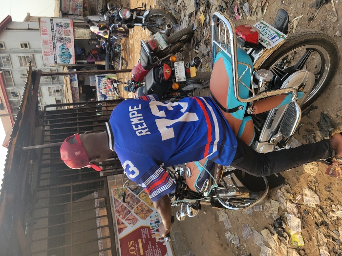 A man in a blue and red baseball jersey and red cap mounts a turquoise and brown motorcycle. The jersey reads "REMPE" with the number "3" visible on the sleeve. The motorcycle has a Nigerian license plate. The scene is outdoors, with litter scattered on the ground and other motorcycles parked nearby. A building with signage is visible in the background.