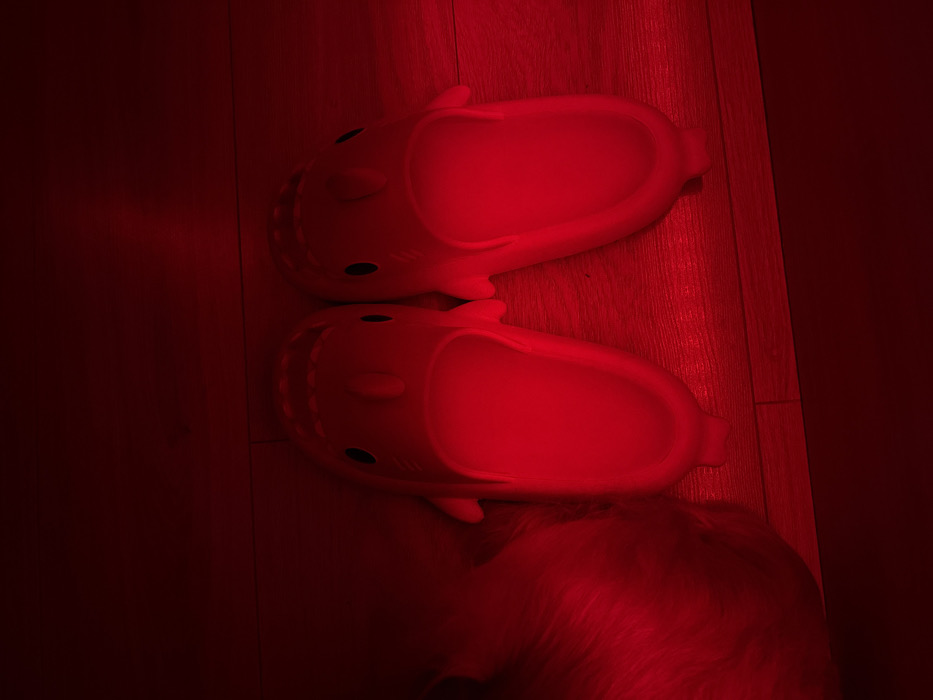- "The image displays two shark-shaped slide sandals positioned parallel to each other on a wooden floor" by FM-kSRys1, licensed under CC BY 4.0