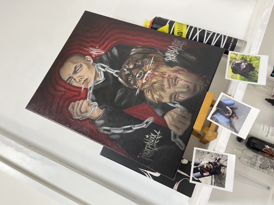 The image displays an interior scene on a white shelf against a white wall in the city of Ovoshchnoy, Russia. The primary subject is a large, diagonally oriented canvas painting, supported by a small wooden easel. The painting depicts a graphic scene against a dark red, wavy background. A bald, pale-skinned individual with light blue eyes and a cigarette in their mouth is shown wearing a dark top, holding a silver chain. This chain connects to a dark-furred Rottweiler dog, which is depicted biting the head of a blonde-haired individual. Blood is visibly dripping from the blonde individual's eyes and head. The painting includes stylized text "morphlixx," a partial "REVENGE" signature, and a "MSM" symbol. Below the painting, on the white shelf, three instant-format photographs feature Rottweiler dogs. To the left, a clear bottle labeled "ТАТУ КРАСКА" (TATTOO INK) and another labeled "БиоАнтисептик" (BioAntiseptic) are visible among other bottles. To the right of the painting, two aerosol cans are present; one yellow and black labeled "KRYLON MAX" and another black can with "MTN" and "94" visible.