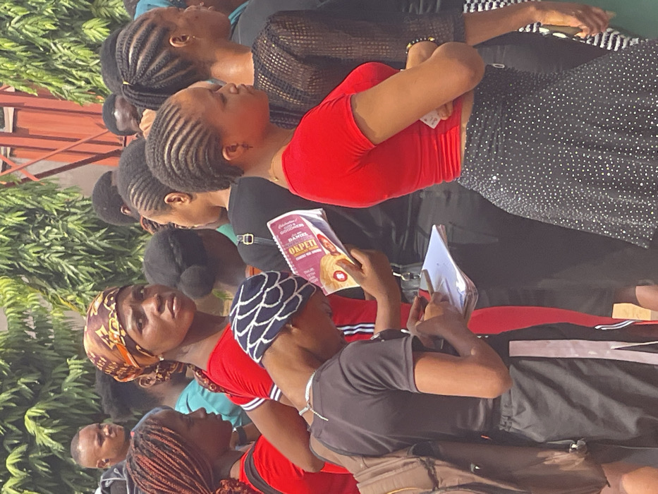 The image depicts a crowded outdoor scene in Umuokpu, Nigeria, focusing on a group of predominantly young individuals. In the foreground left, an individual wearing a black short-sleeved top, black shorts with white side stripes, and a brown backpack is shown from the waist up, facing downwards. This person wears a blue and white patterned head covering and is actively writing on a white pad or clipboard with a pen in their right hand, while holding a mobile phone in their left hand. A silver bracelet is on their left wrist. Immediately behind this individual, slightly to the right, a female wearing a red short-sleeved top and a brown and gold patterned headscarf looks directly towards the viewer with a neutral expression. Her ears are visible, suggesting earrings. To her right, a young female wears a red short-sleeved top and a dark, possibly black, flared skirt with small white polka dots. Her hair is styled in cornrows leading backward, and she has a small cross earring on her left ear and a gold necklace. She is looking to her right, away from the camera. Behind the person writing, another individual holds a pink and purple pamphlet or booklet with the word "OKPETI" prominently displayed. Further back and to the left, a male with short hair and a light-colored top is partially visible, looking to his right. Other obscured individuals are present throughout the background, indicating a dense gathering. The background features bright green foliage from trees or bushes on the left, transitioning to a reddish-brown structure on the upper right. The scene is illuminated by strong daylight.