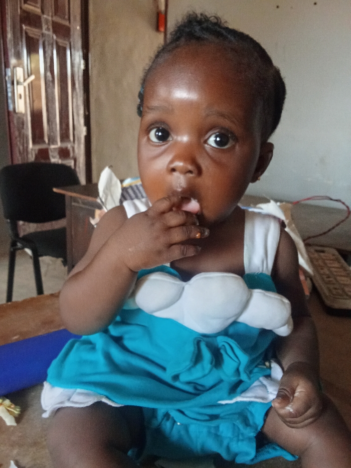 A close-up photograph captures a dark-skinned toddler seated indoors, looking directly at the camera