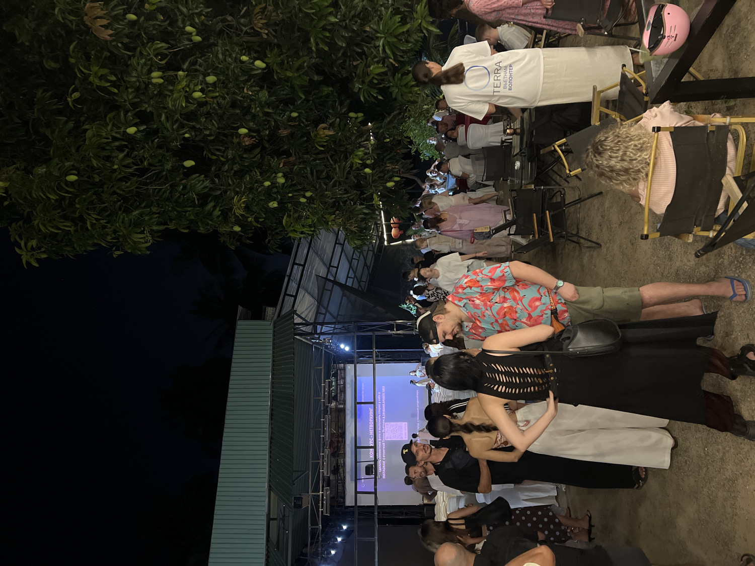 Here's a description of the image: The image captures an outdoor event likely in Tây Nha Trang, Vietnam. A small stage is set up with a screen displaying the words "Конкурс-нетворкинг" along with instructions. A mixed crowd of people are seated facing the stage. Many are holding up phones, seemingly taking pictures or videos. People are dressed in a variety of casual clothing, from t-shirts and dresses to floral shirts and pants. The setting appears to be under a partially covered structure and a large tree with green fruit. The overall impression is of an informal, outdoor gathering for a presentation or event. The lighting suggests that it's taking place in the evening.