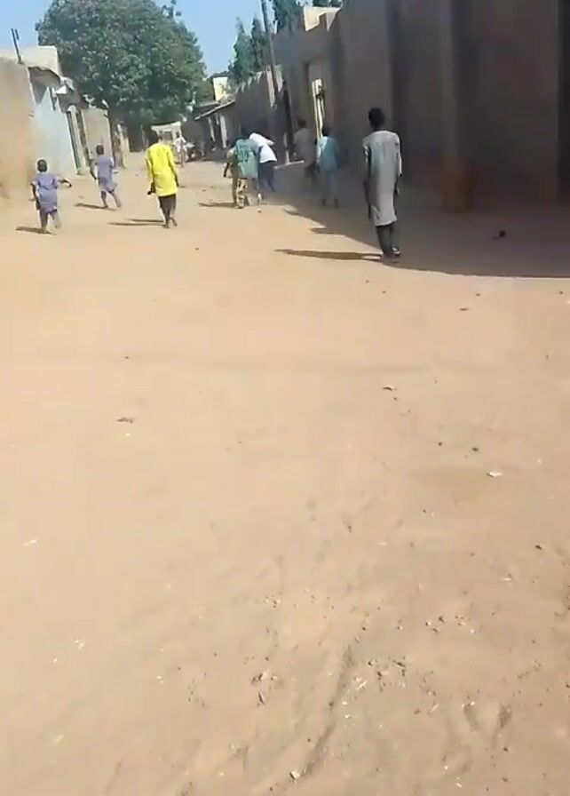 group of children running down a sandy road in a village or town