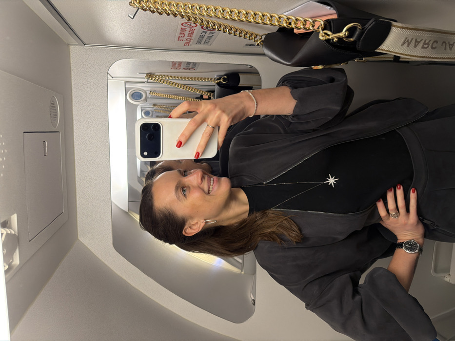 A woman takes a selfie in a mirrored airplane bathroom. She wears a black jacket and top with a star pendant necklace. Her nails are painted red. Above, a black purse with a gold chain and branded strap hangs in the mirror's reflection. The airplane's interior is visible, featuring a wall panel with a door-like feature. The lighting is bright, and the woman is smiling.