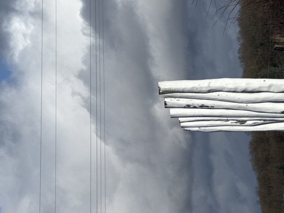 The image depicts an outdoor scene in Echzell, Germany, under a heavily clouded sky. In the foreground, a series of approximately seven irregularly shaped, vertical wooden posts or pillars are arranged from right to left, decreasing in height. These posts are painted white, exhibiting weathering and dark streaking on their surfaces. To the lower right, a segment of a wire fence and a dark wooden fence post are visible. Immediately behind the white posts and fence line, a dense, dark forest of deciduous trees without foliage extends horizontally across the lower background. Above this tree line and behind the posts, four thin, dark power lines traverse horizontally across the mid-ground against the overcast sky. The sky itself is dominated by large, dark grey cumulus clouds, with a small patch of clear blue sky visible in the upper left corner. No individuals or active interactions are present in the scene.