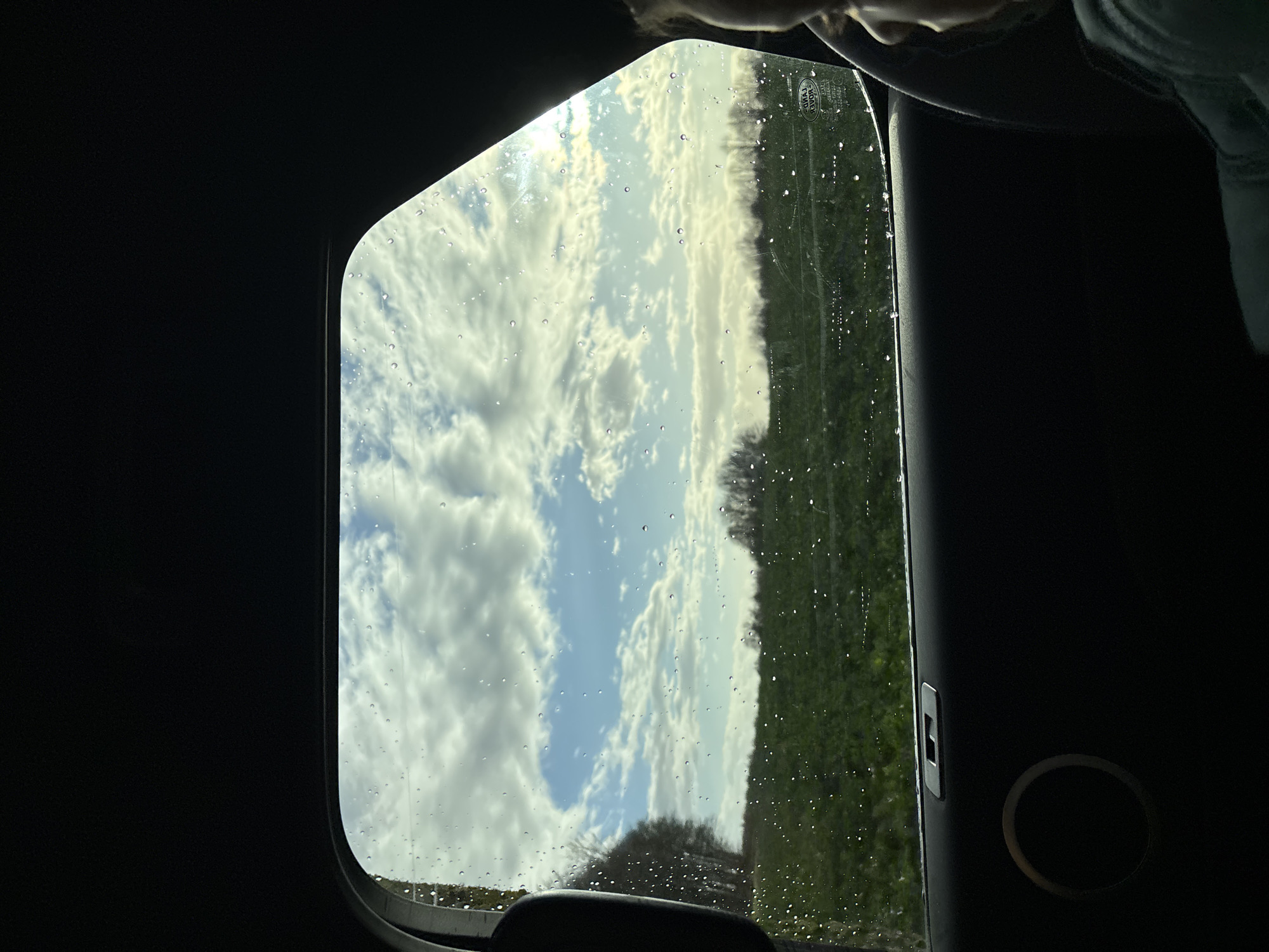 n interior view through a car window, likely during or after a car wash, as water droplets are visible on the glass. The window frames a view of the sky with patchy clouds and a portion of land with greenery. The foreground is dominated by the dark interior of the car. A person's head and shoulder are partially visible at the top of the frame. The location is uncertain; however, the prompt indicates it is likely somewhere in Differdange, Luxembourg. The focus is on the view through the window rather than specific actions or interactions. A speaker or vent is visible on the right-hand side of the car's interior.