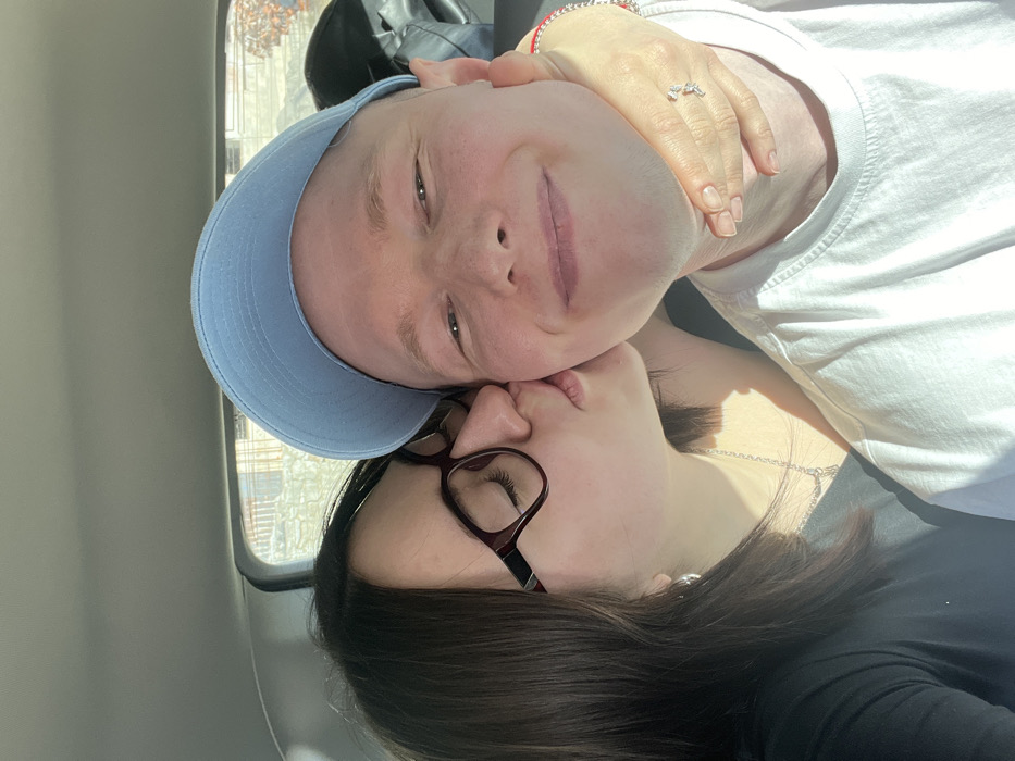 The image depicts two individuals, a female and a male, inside a vehicle, likely a car, under natural daylight conditions. The scene is within the city of Podgorica, Montenegro. The female subject is positioned on the left, with dark brown hair and dark-rimmed eyeglasses. She wears a dark top, a silver chain necklace, and a small silver earring. Her eyes are closed as she kisses the right cheek of the male subject. Her right hand, adorned with a silver-colored ring featuring small stones on the ring finger, is placed around the male's neck, gently cupping his jawline. The male subject is on the right, wearing a light blue baseball cap and a white crew-neck t-shirt. He faces the camera directly with a slight smile. Sunlight illuminates the right side of his face and shirt. The interior background shows a light-colored car headliner at the top. Through the vehicle window, a blurred exterior environment is visible, featuring indistinct light-colored building structures. A dark object, possibly a bag or garment, is partially visible behind the male subject's head on the right. No specific landmarks within Podgorica are identifiable from the blurred background.
