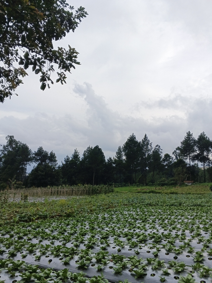 The image displays an agricultural landscape in Kabiufa, Papua New Guinea, under an overcast sky. The foreground features a large field cultivated with small, green-leafed plants arranged in orderly rows, growing through circular perforations in black plastic mulch. Beyond this, in the midground, additional cultivated areas are visible, including a section with vertical wooden stakes or trellises supporting plants. The background is dominated by a dense line of tall, dark green evergreen trees (conifers) forming a natural barrier. A small, dark-roofed structure is partially visible in the far mid-right, obscured by foliage. The sky above is entirely covered with grey and white clouds. An out-of-focus branch with dark green leaves extends into the frame from the upper left corner. No people or active interactions are discernible.