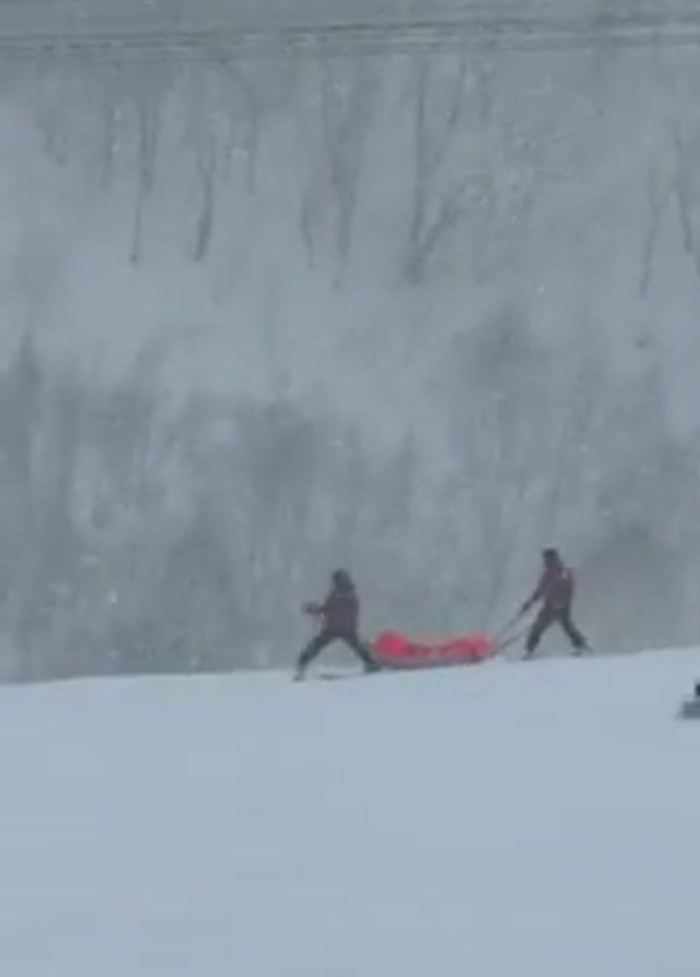 In a wide shot in a snowy, wintry environment, two people in ski gear pull an orange sled. The sled has someone lying down within it. Another person on a snowboard passes them going in the opposite direction. The two skiers appear to be skiing down a mountain. There is a treeline in the background and a power line is visible near the top of the frame.