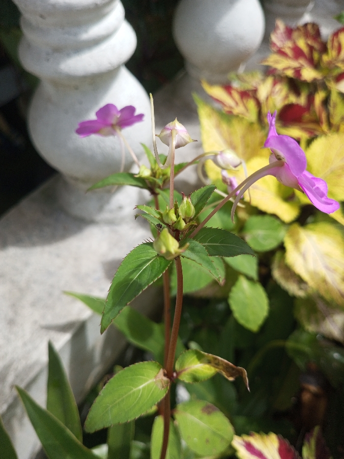 This image, captured in Mindat, Myanmar, presents a close-up view of flowering plants in an outdoor setting. The central subject is a plant with slender reddish-brown stems and dark green, ovate, serrated leaves. Multiple flower buds are visible, clustered along the stems. Two fuchsia-purple flowers are prominent: one on the right is in profile, displaying a distinct spurred morphology, and another in the upper left is partially visible, viewed from above. A small, dark, segmented insect, consistent with an ant or aphid, is present on one of the stems amidst the buds. In the background, a white, molded concrete or stone balustrade, featuring two rounded, bulbous elements, is partially visible. Further back, out-of-focus foliage includes plants with solid green leaves and others displaying yellow, red, and maroon variegation. The scene is illuminated by strong natural light, indicating a sunny environment. No people are visible.