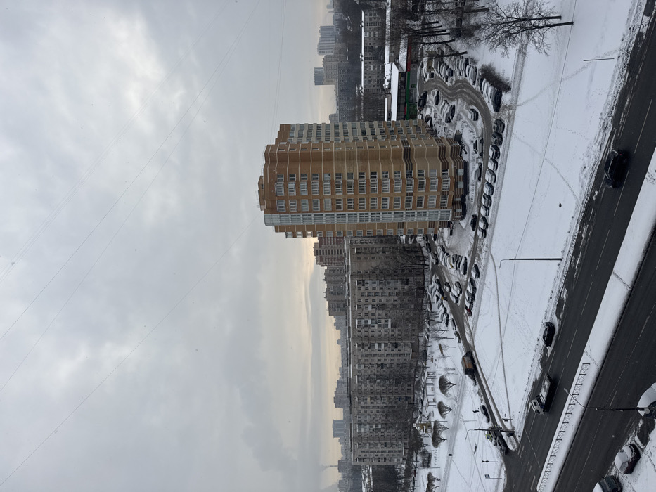 A cityscape under a cloudy sky displays a tall beige building surrounded by gray, similar-height structures. Snow covers the ground and lines a road, where cars are parked or moving. Numerous cars fill winding parking lots adjacent to the buildings. Bare trees dot the landscape, suggesting winter. Utility poles and overhead wires are visible against the sky.