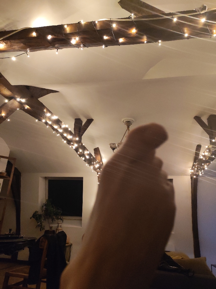 A blurry image shows the interior of a room with exposed wooden beams decorated with string lights. The beams form a structural design across the ceiling, with a chandelier visible in the center. A window is seen on the left, partially obscured by furniture and a plant. The dominant feature is a blurred, light-skinned shape, possibly a body part, in the foreground, which significantly obstructs the view of the room.