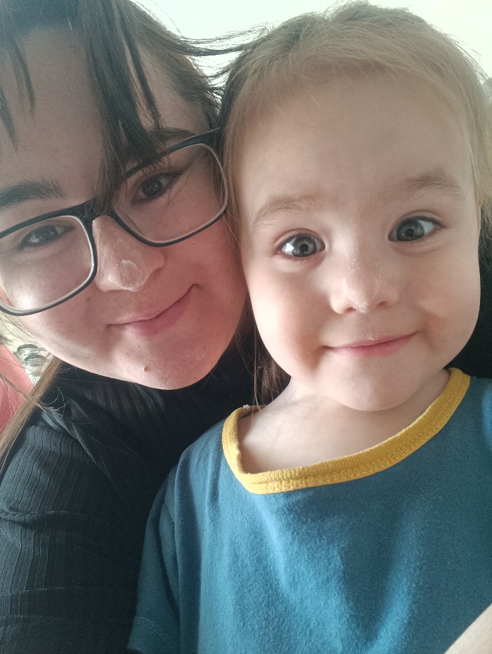 A close-up vertical photograph captures an adult female and a young child in an indoor setting. The adult female, positioned on the left, has dark hair, wears black-framed glasses, and a black ribbed top. White powdery residue is present on her nose and left cheek. She smiles faintly, looking at the camera. The young child, on the right, has light-colored hair, large eyes, and a slight smile. The child wears a teal t-shirt with a yellow collar trim. Both individuals are looking directly at the viewer. The background is blurred and indistinct, showing soft light and amorphous shapes, including a vague suggestion of a glass object towards the upper left. No identifiable features within the image indicate a specific location in the city of Посад, Russia.